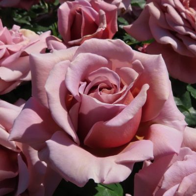 Rosaio del vivaio greco Avramis con fiori a mazzetti ma di medie dimensioni, dai colori cangianti rosa e giallo sfumati.